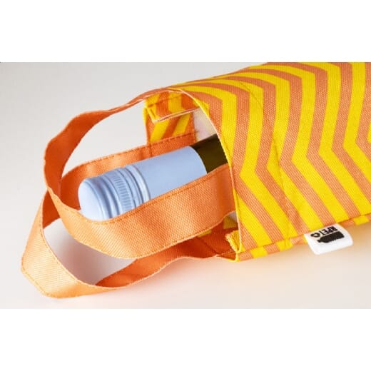 Borsa per bottiglie di vino in poliestere 600D RPET con manici corti, personalizzabile con grafica stampata in sublimazione su tutta la superficie ed etichetta RPET. MOQ: 25 pezzi.