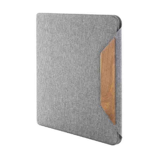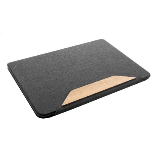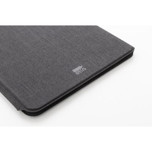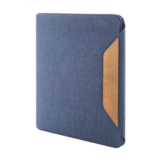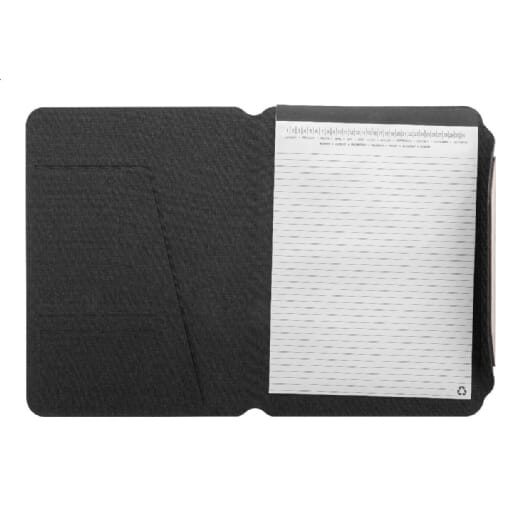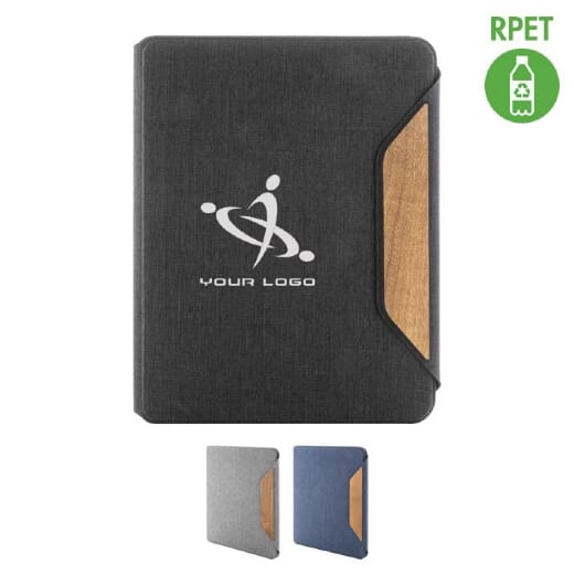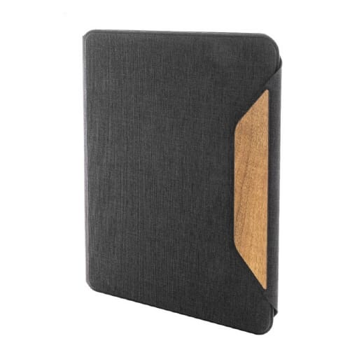 Cartella portadocumenti in poliestere RPET, formato A4, con molteplici tasche organizer interne, chiusura magnetica, dettagli in legno di noce e blocco da 20 fogli a righe in carta riciclata.